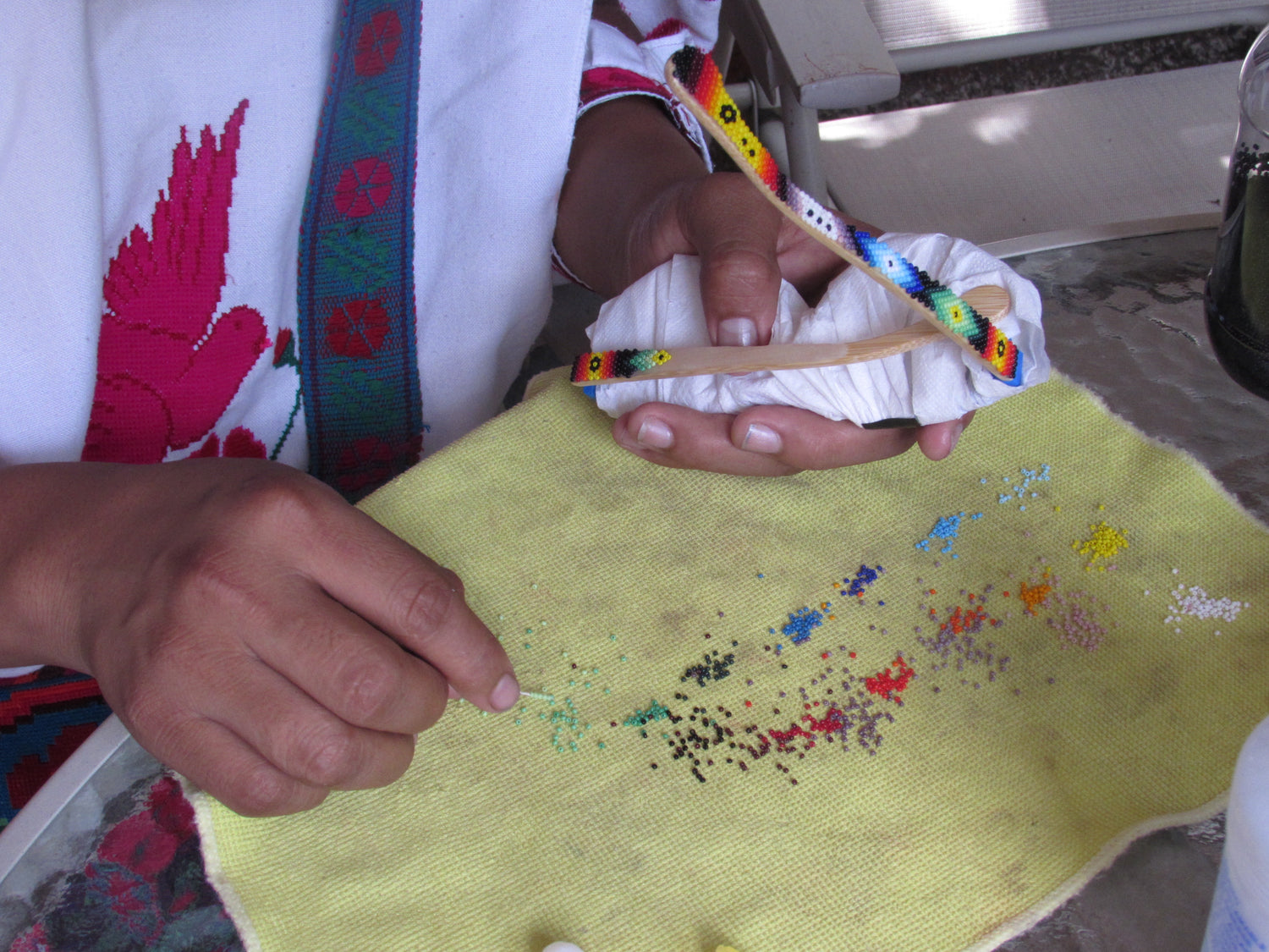 El origen del arte huichol radica en una tradición ancestral, la transcripción física de las imágenes visualizadas por los chamanes huicholes; inducidas por la ingestión del Peyote (hikuri), su cactus sagrado, permitiéndoles franquear el umbral de lo desconocido y así relacionarse con lo dívino. Estas obras de arte huichol son hechas con chaquiras ó con hilo (estambre), cada una lleva simbólicos motivos, historias de la cultura huichol y leyendas huichol de su cosmogonía que nos ofrecen un panorama de la sociedad Huichol.