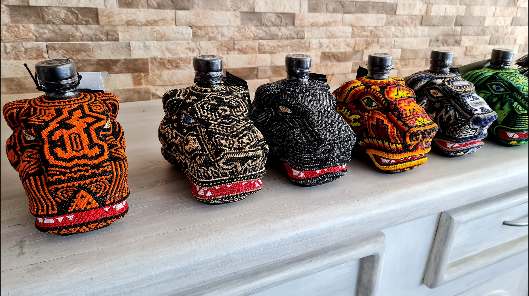 Botella Pantera Jaguar en Arte Huichol. Hecha por Artesanos Mexicano.